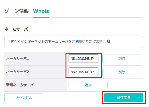3『ネームサーバー1』と『ネームサーバー2』に記入されている情報を、弊社のネームサーバー情報に変更し、『保存する』をクリックします。