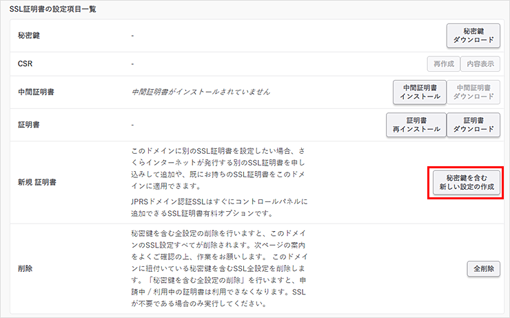 - JPRSドメイン認証型をご利用中の場合、更新対象期間(有効期限の1ヶ月前)にのみ設定可能です。