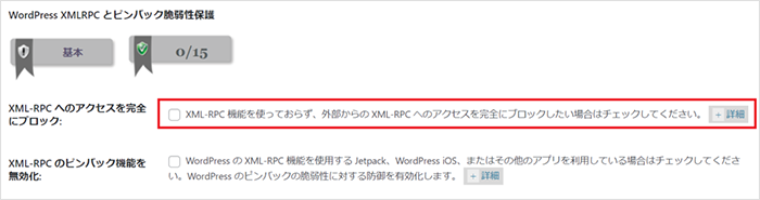 2WordPress XMLPRCとピンバック脆弱性保護(WordPress XMLRPC & Pingback Vulnerability Protection)の「XML-RPCへのアクセスを完全にブロック(Completely Block Access To XMLRPC)」にチェックを入れ、無効化を行います。