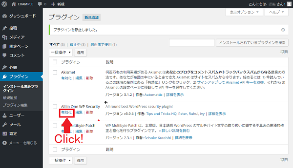 3<プラグイン>の画面に変わりますと、『All In One WP Security』という項目がありますので、All In One WP Securityの文字のすぐ下にある「有効化」の文字をクリックしてください。