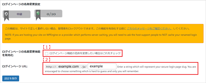 2【1】のチェックを入れると、【2】で指定したURLがWordPressのログインURLになります。この場合、 「http://example.com/example」がWordPressのログインURLに変更されます。