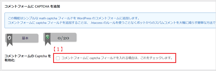 2【1】のチェックを入れる事で、コメント欄にcaptcha(応答者がコンピュータでないことを確認するための簡単なテスト)を入力するフォームを追加します。スパムコメントの大半はボット(botと呼ばれる自動化されたプログラム)によって投稿されますが、これによりスパムコメントを抑制できます。