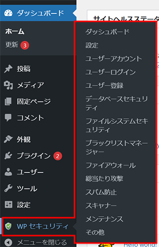 4左側のメニューに「WP Security」の文字で項目が追加されます。「WP Security」をクリックするか、マウスオーバーする事でAll In One WP Security内の各メニューにアクセスする事ができます。