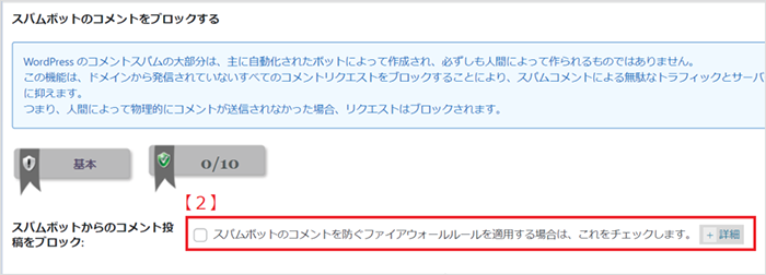 【2】のチェックを入れる事で、ドメインから発信されていないすべてのコメントリクエストをブロックします。これにより、Wordpress側で自動的にロボットからの入力と思われるコメントをブロックし、人間によって入力されたコメントのみを受け付けるようになります。