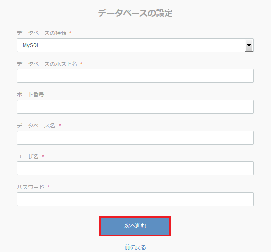 データベースパスワード | データベースの作成時に設定したパスワードを入力します。 ※[作成したデータベースがある場合]でデータベースを作成された場合は、設定済みのデータベースパスワードを入力します。 |
