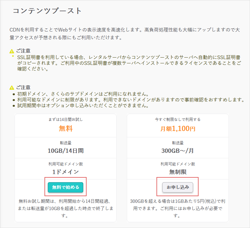コンテンツブースト機能はレンタルサーバーのプランによって利用料金が異なります。