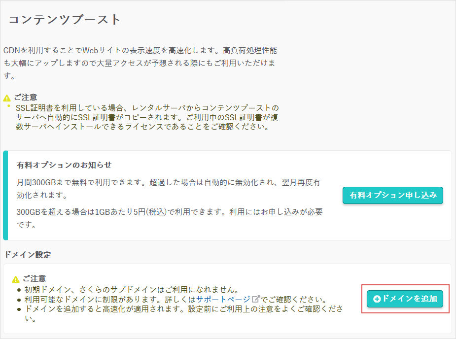 ※「www.example.com」「examlple.com」のように、同じドメイン名でwww有無のドメインが各々、ドメインの設定に⼊っている場合、ご利⽤いただけません。この場合「www.example.com」側のドメインの設定を削除するか、コンテンツブーストではなく、ウェブアクセラレータの利⽤をご検討ください。その他、詳しくは利用条件の項⽬をご確認ください。