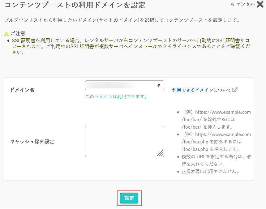 4選択したドメインでコンテンツブーストが利用できる場合は、以下の画面が表示されます。 『設定』をクリックします。