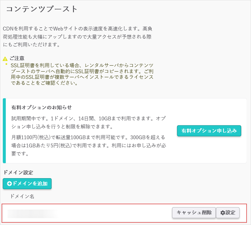 コンテンツブースト機能が利用できるかどうかはドメインとネームサーバーの利用状況によります。