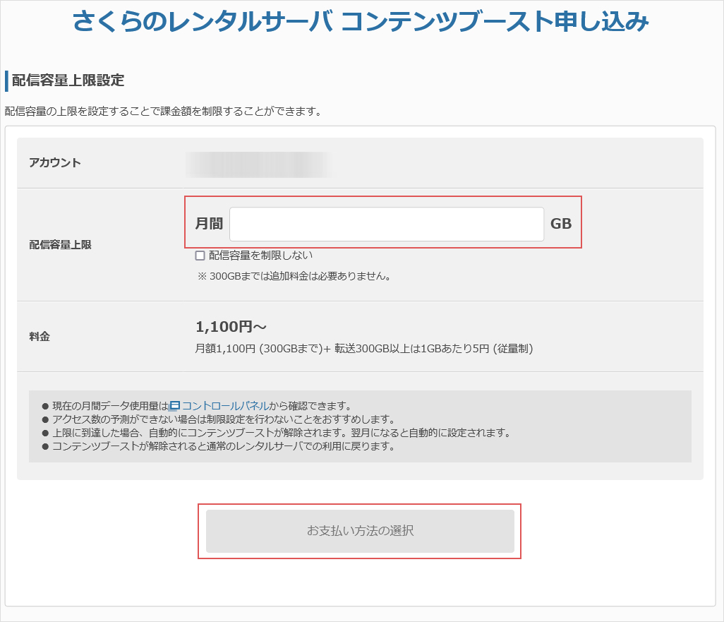 - 支払い方法はサーバーコントロールパネルからの利用登録時に設定できます。