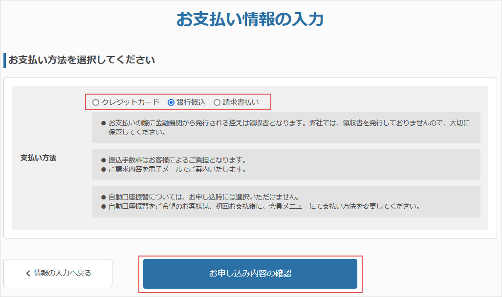 4お支払い方法を選択し、『お申し込み内容の確認』をクリックします。