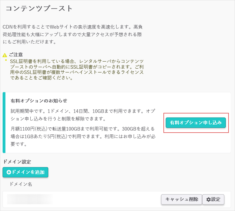 無料お試し期間の利用で問題が無ければ、コンテンツブーストオプションのお申し込みください。