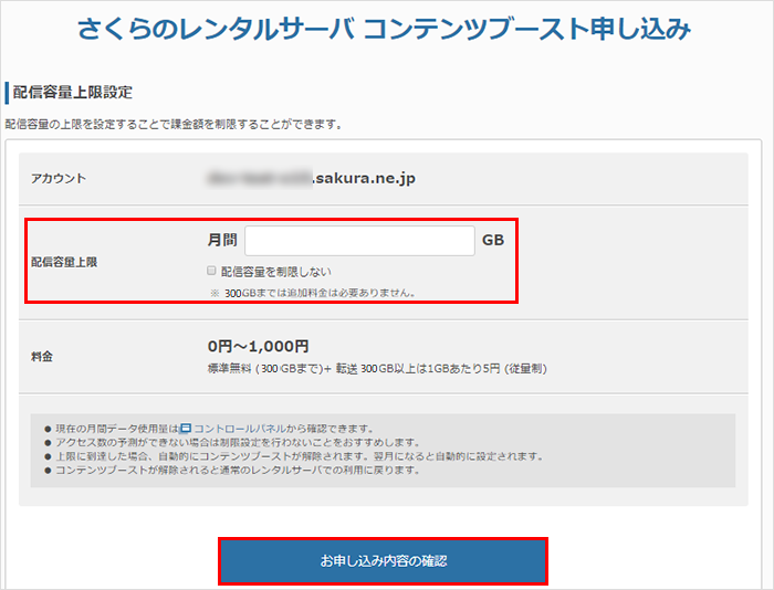 3配信容量上限を設定していただき、『お申し込み内容の確認』をクリックします。