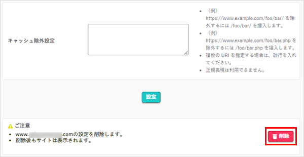 - キャッシュ除外設定で新たに追加や削除した設定をすぐに反映させたい場合は、キャッシュ削除を行ってください。