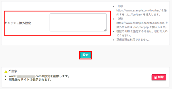 キャッシュしたくないURLがある場合は、「キャッシュ除外設定」に入力します。