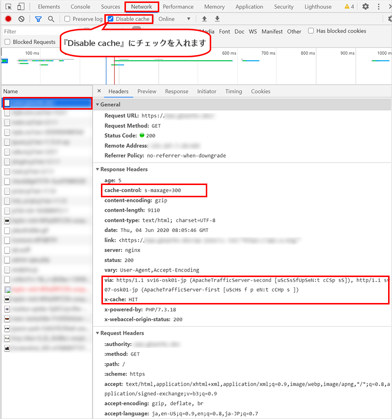 ※x-cache:HITになっていない場合、数回リロードを行っていただくとキャッシュが作成され、HITになります。