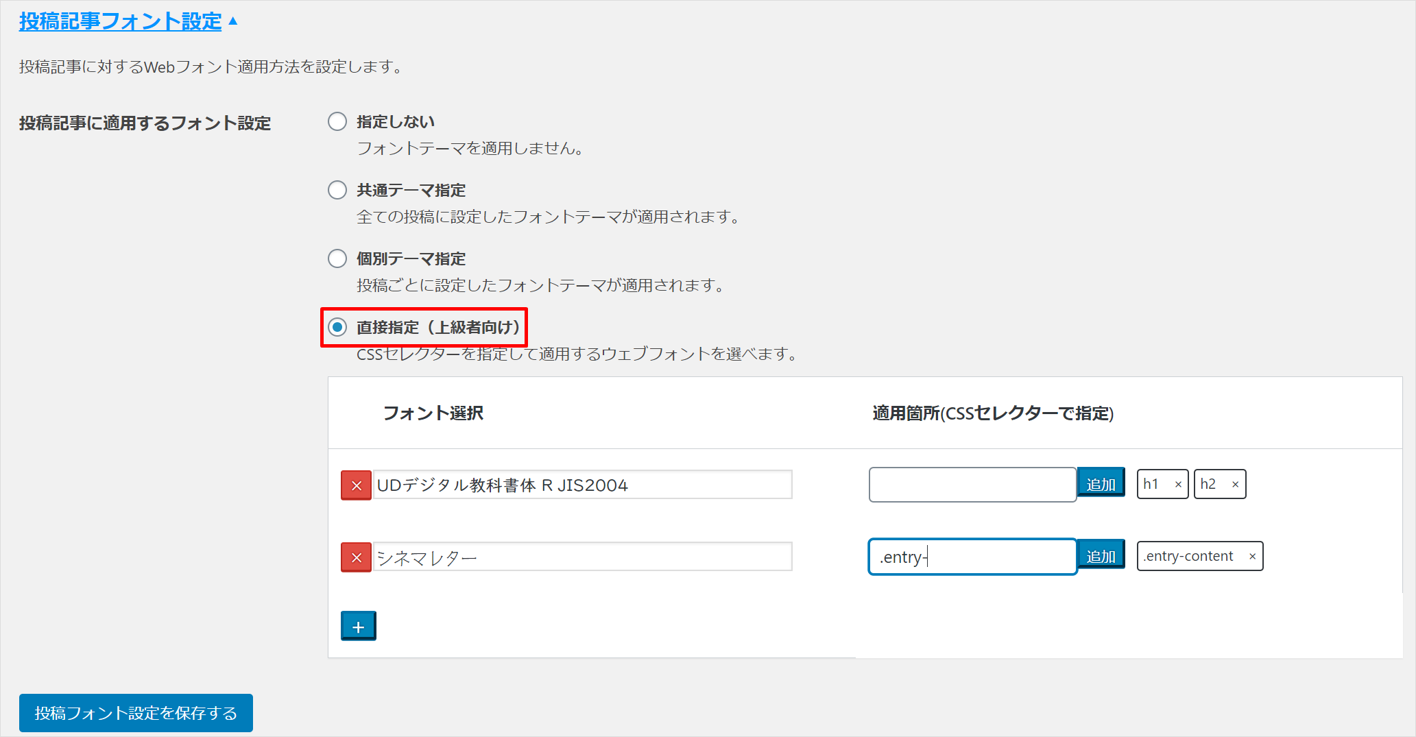 1投稿記事フォント設定の「直接指定(上級者向け)」をクリックし、フォント選択適用箇所の順に入力します。