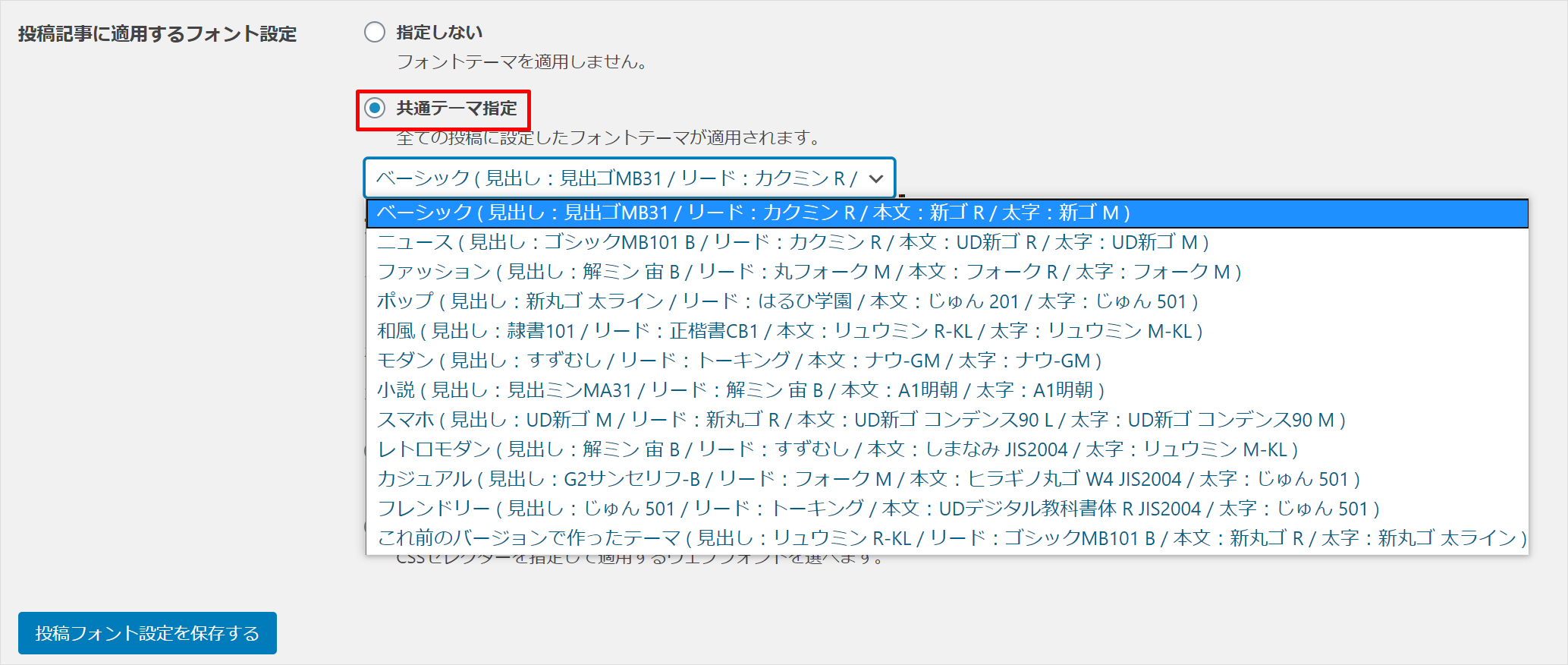 3好きなテーマを選択して「投稿フォント設定を保存する」をクリックします。