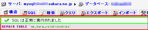 6「SQLは正常に実行されました」でREPAIR TABLE 選択したテーブルと画面に変わると復元作業は完了です。