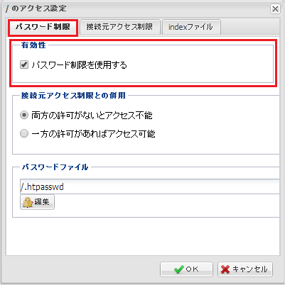 両方の許可がないとアクセス不能 | 『 パスワード制限 』『 接続元アクセス制限 』の両方のタブに設定された条件を満たさない限り、アクセスが拒否されるようになります。 |