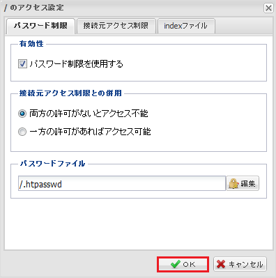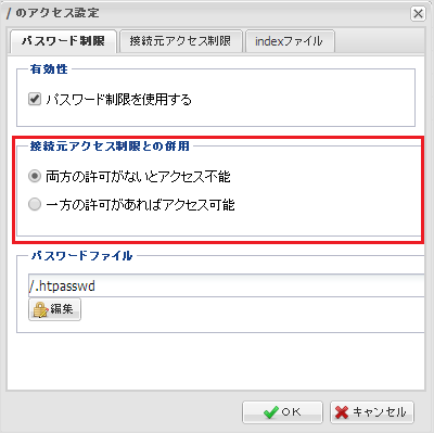 一方の許可があればアクセス可 | 『 パスワード制限 』『 接続元アクセス制限 』のいずれか一方のタブに設定された条件を満たせば、アクセスが許可されるようになります。 |