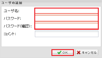 『 ユーザ名 』『 パスワード 』『パスワード(確認) 』を入力し、『 OK 』ボタンをクリックします。