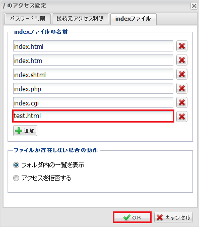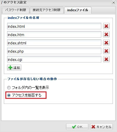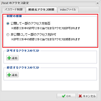 接続ホストやIPアドレスで制限をかけます。設定を行った下層フォルダに適用されます。