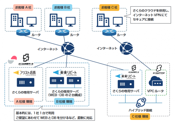 また、「さくらのVPS」「さくらのクラウド」も併用しています。「専用サーバを軸としながら、拡張性や柔軟性が必要なケースではクラウド、VPSも使い分けています」と芳野氏は話します(下図)。