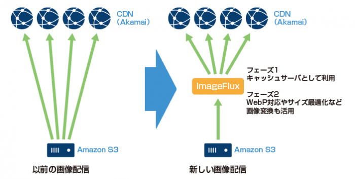 メルカリでは、画像ファイルを格納しているオリジンサーバをそのまま利用できることを要件として複数のソリューションを検討し、最終的にImageFluxの導入を決定しました。「試算した月額費用と、実際にオリジンサーバに対するオフロード率などの性能を見てImageFluxに決定しました」(久保氏)。実際にImageFluxをキャッシュサーバとして利用することで、オリジンサーバに対するオフロード率を大きく向上させることができました(フェーズ1)。
