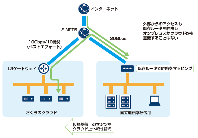 ネットワーク構成は、さくらのクラウド上のセグメントと遺伝研内のセグメントを高速なSINET5のネットワーク網を介してL3ゲートウェイで接続しています。さくらのクラウド上の仮想マシンは、遺伝研内部にある既存のハードウェアルータにおいてIPアドレスマッピングがなされており、IPアドレスの見かけ上は遺伝研へのアクセスとなる仕組みです。