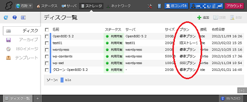 3. 作成されているディスク一覧のリストが表示されます。リストの「プラン」カラムの内容が「旧ストレージ」であれば、旧ストレージ上に存在するディスクとなります。