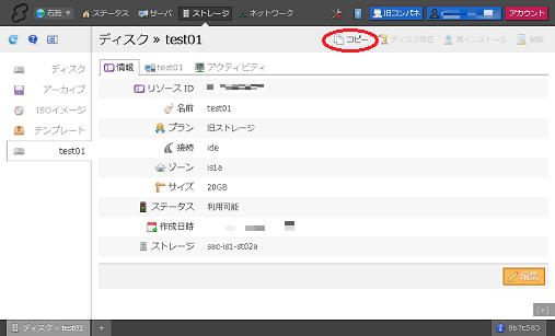 4. 対象となるディスクをダブルクリックすることで詳細情報を確認できます。ここで「プラン」部分が「旧ストレージ」であることを再度確認し、ディスク名右側の「コピー」ボタンをクリックします。