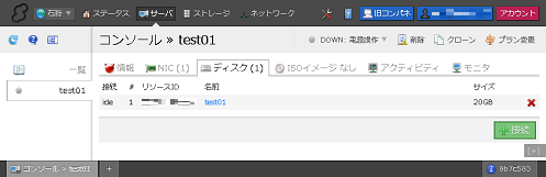 3. 「ディスク」タブを選択すると、サーバに接続されているディスクの一覧が表示されます。