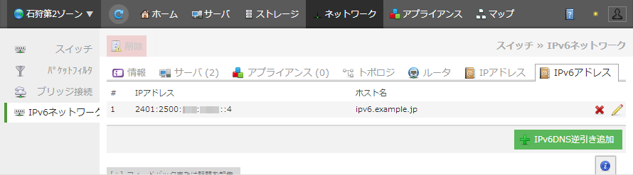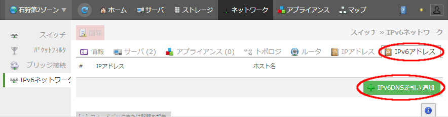 スイッチ詳細画面上部の「IPv6アドレス」タブをクリックすると、IPv6の逆引きDNS登録リスト画面が表示されます。新たに登録する場合はリスト下部の「IPv6DNS逆引き追加」ボタンをクリックします。