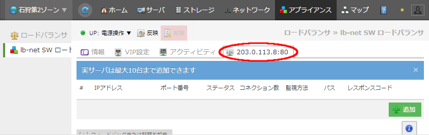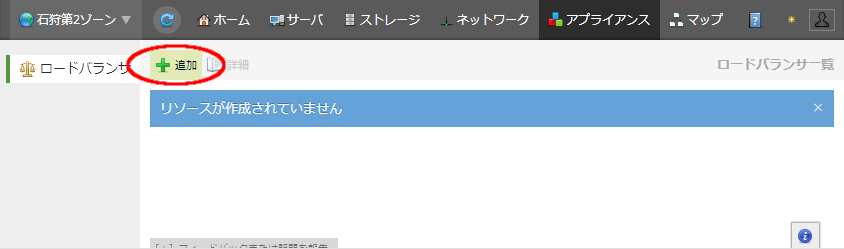 スイッチにロードバランサを追加します。画面上部のメニューより「アプライアンス」をクリックするとロードバランサ一覧画面が表示されるので、この画面左上の「追加」ボタンをクリックして作成を開始します。
