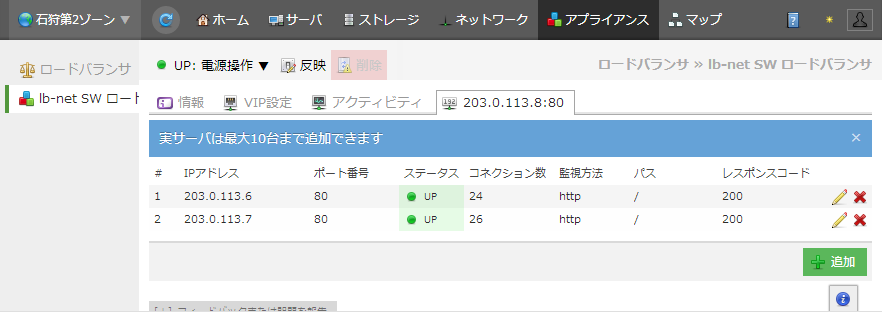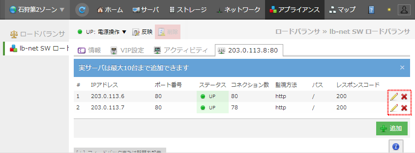 ※設定の追加、変更後は「反映」ボタンをクリックし、設定内容をロードバランサに反映する操作が必要です