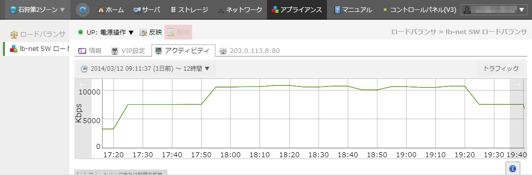 ロードバランサのトラフィックグラフが表示されます。特定の時間を拡大するなど、操作はサーバのアクティビティモニタと同様に行えます。