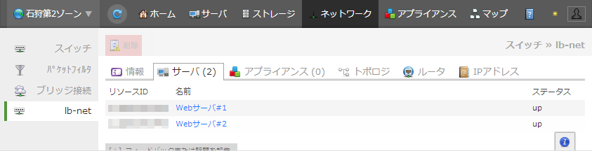 削除前にロードバランサをシャットダウンする必要があります。「電源操作」メニューからのシャットダウン操作後、電源が「DOWN」状態になったことを確認し、削除ボタンをクリックします。
