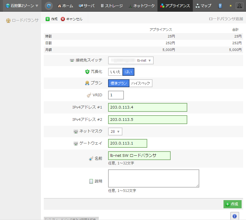 | 接続先スイッチ | ロードバランサを接続したいスイッチ |