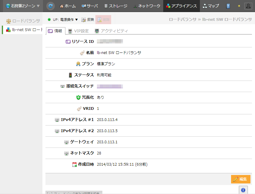 入力後、「作成」ボタンをクリックすると仮想IPアドレスが設定されます。スイッチ詳細画面では、作成した仮想IPアドレスのタブが新たに表示されます。