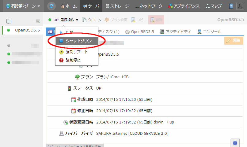 サーバリスト画面より対象サーバをダブルクリックし、電源操作メニューより「シャットダウン」または「強制停止」を選択します。