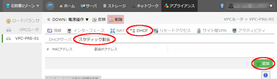 ※DHCPサーバ設定の追加・変更・削除を行った場合、「反映」ボタンをクリックしVPCルータ側への設定反映が必要となります(VPCルータが起動状態の場合でも、電源をシャットダウンすることなく「反映」ボタンのクリックで設定が反映されます)。