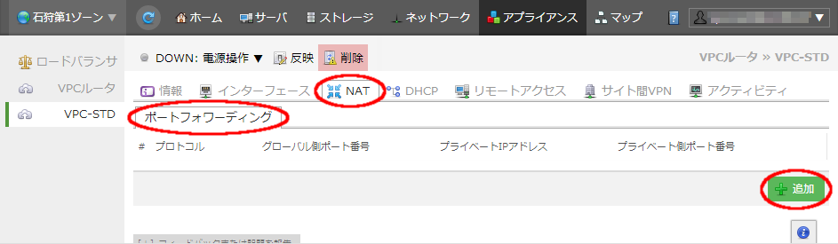 ※ポートフォワーディング設定の追加・変更・削除を行った場合、「反映」ボタンをクリックしVPCルータ側への設定反映が必要となります(VPCルータが起動状態の場合でも、電源をシャットダウンすることなく「反映」ボタンのクリックで設定が反映されます)。
