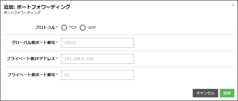 | ポートフォワーディング対象パケットのプロトコルをTCPまたはUDPから選択 | |