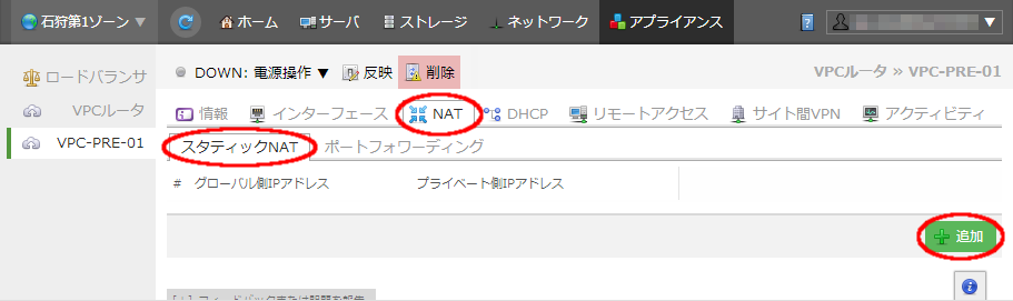 ※スタティックNAT設定の追加・変更・削除を行った場合、「反映」ボタンをクリックしVPCルータ側への設定反映が必要となります(VPCルータが起動状態の場合でも、電源をシャットダウンすることなく「反映」ボタンのクリックで設定が反映されます)。