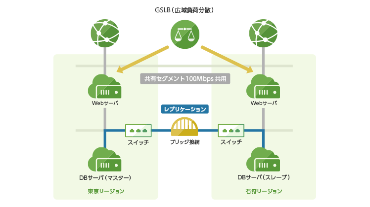- WebサーバーへのアクセスはGSLB(広域負荷分散)によって冗長化し、DBサーバー間はブリッジ接続によりレプリケーション。