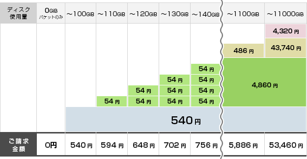 100GiB以下 | 540円 | - | 100GiB以下のご利用は固定料金となります。 |