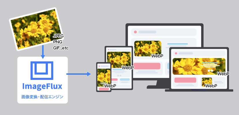 1枚の画像をもとに画像の拡大縮小、切り抜き、合成などによりデバイスに最適化された画像を簡単に生成し、高速かつ高品質で配信することができるクラウドサービスです。ECサイトや電子書籍サービス、口コミアプリケーションといった画像ファイルを多用するサービスにて、デバイスに合わせた画像変換および画像にまつわるサーバー管理や脆弱性対応などの運用コストを抑えることができます。2016年の提供開始以来、メルカリさまや資生堂さまをはじめとした法人から個人まで幅広いお客さまにご利用いただいています。