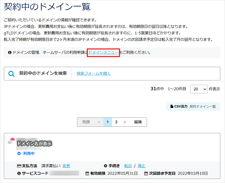契約中のドメイン一覧が表示されます。