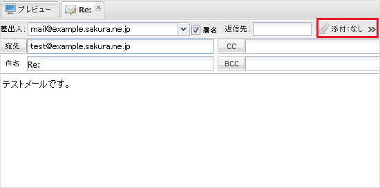 件名およびメール本文を入力し、『添付:なし 』ボタンをクリックします。
